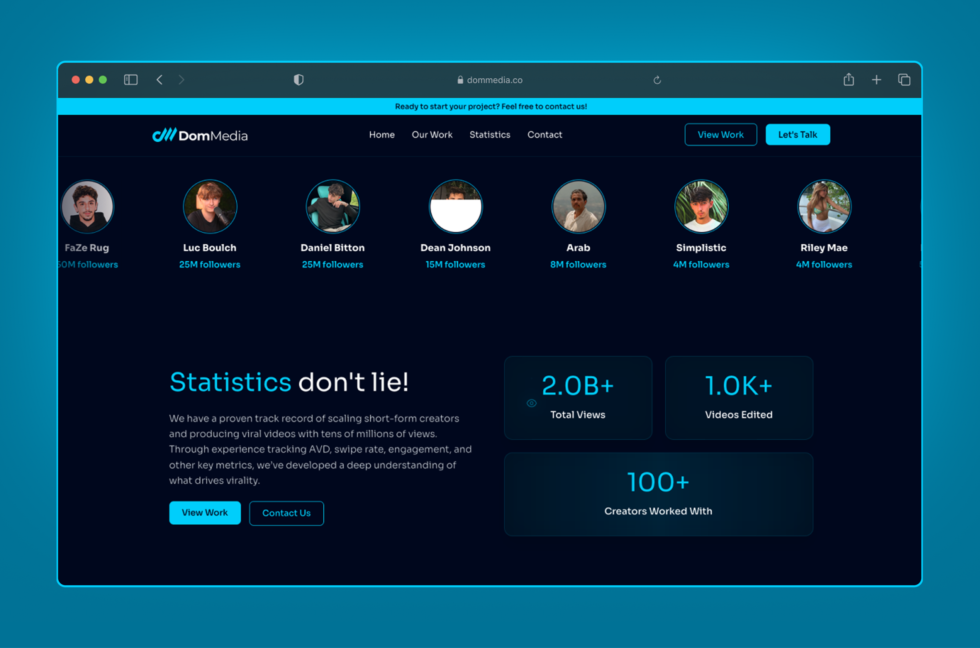 Dom Media specializes in high-volume video editing for short-form creators, and they approached us to create a website that would effectively showcase their specialized services and attract creators looking for professional video editing support. They work with impressive clients such as Jack Doherty (30 million followers) and Faze Rug (50 million followers), demonstrating their expertise in handling high-profile creator content. Their team delivers professional-quality content with expertise and attention to detail that helps creators grow their audience and gain an edge in the increasingly competitive creator economy. We designed a modern, responsive website using Next.js and TypeScript that highlights their video editing expertise, showcases their portfolio of work, and provides an easy way for creators to get in touch. The website successfully communicates their value proposition and has helped them attract more clients in the creator economy space.